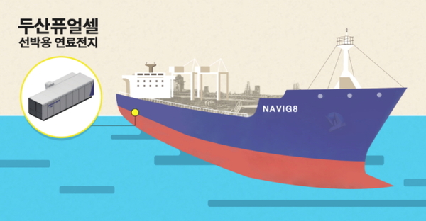 ▲ 두산퓨얼셀이 글로벌 선사인 나빅8(Navig8)과 손잡고 친환경 선박용 연료전지 개발에 나선다. 두산퓨얼셀은 현재 개발 중인 한국형 고효율 고체산화물 연료전지(SOFC)를 나빅8가 발주할 5만톤급 석유화학제품 운반선에 탑재하고 추진동력 및 선박 내 전원으로서의 실증을 진행할 계획이다.두산퓨얼셀이 글로벌 선사(船社)인 나빅8(Navig8)와 손잡고 친환경 선박용 연료전지 개발에 나선다. 발전용 연료전지 사업을 주력으로 삼아온 두산퓨얼셀이 수소산업과 연계된 새로운 사업 모델을 발굴한 첫 사례다.