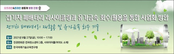 최근 전기차 산업의 급격한 성장으로 폐배터리 시장도 본격 급성장할 전망인 가운데 한국미래기술교육연구원은 오는 8월 27일 서울 여의도 전경련회관 사파이어홀에서 ‘전기차 폐배터리 리사이클링과 유가금속 회수/활용을 통한 사업화 방안’ 세미나를 온, 오프라인으로 병행해서 개최한다고 밝혔다.