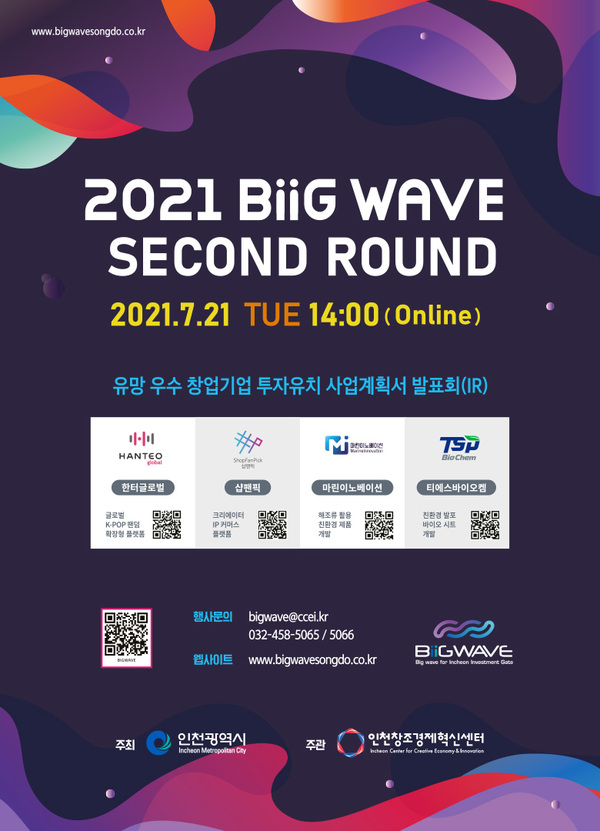 인천창조경제혁신센터는 7월 21일 ‘2021년도 제2회 빅웨이브 IR(투자 유치 사업 계획 발표회)’를 개최한다. ‘빅웨이브’는 인천 지역 유망 기술 벤처 창업 기업의 육성과 인천 투자 생태계 활성화를 위해 인천창조경제혁신센터, 인천광역시가 공동으로 만든 투자 유치 플랫폼 브랜드다. 4월 새로운 출발을 알렸다.
