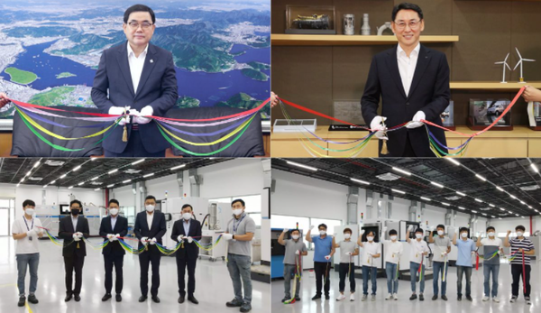 ▲ 두산중공업이 온라인으로 진행한 3D프린팅 전용 팹 준공식 행사에서 허성무 창원시장(왼쪽 위), 두산중공업 정연인 사장(오른쪽 위), 두산중공업 송용진 부문장(왼쪽 아래, 왼쪽에서 4번째), 두산중공업 3DP기술개발팀이 릴레이 테이프커팅을 진행하고 있다.두산중공업이 지난 9월 30일 경남 창원 본사에서 3D프린팅 전용 팹(FAB, 제조 공장) 준공식을 비대면으로 개최했다. 허성무 창원시장이 축하 인사를 전했고, 국방기술품질원 허건영 원장, 한국생산기술연구원 이낙규 원장, 두산중공업 정연인 사장, ㈜모트롤 권영민 대표 등 주요 인사들이 온라인으로 준공식에 참석했다.