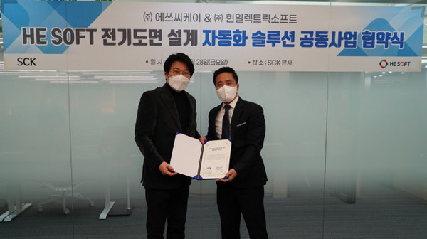 ▲ 왼쪽부터 이승근 에쓰씨케이 대표와 김현 현일렉트릭소프트 대표가 총판 계약을 맺고 기념 촬영을 하고 있다.소프트웨어 솔루션 유통업체 에쓰씨케이(SCK)가 최근 현일렉트릭소프트와 전장 설계 자동화 솔루션 시장을 함께 개척하기 위한 협약을 체결했다고 밝혔다.