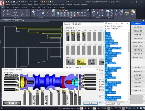 ▲ 캐디안 기반의 CAM 솔루션, 파워엔씨의 CNC선반의 예CAM 개발사 서안엔지니어링의 파워엔씨는 밀링(Milling), CNC선반, MCT(머시닝센터), 절단 작업이 가능하다. CNC가 장착된 가공기의 모션 제어 코드와 툴링의 선정, 작업 최적화, 현장 작업에 필요한 가공조건 도면, BOM, 가공 견적서를 자동으로 변환 생성하는 등의 기능과 Flame/Plasma/Laser Cutting, Wood Milling, WireEDM, Lathe, Milling, DNC 등 다양한 모듈로 구성되어 있다.