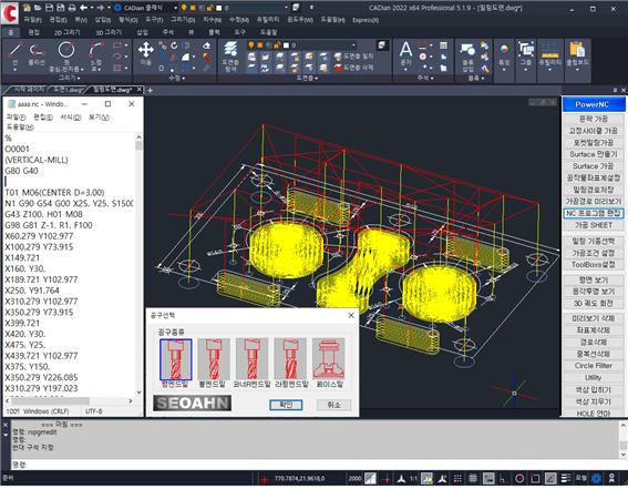 ▲ 캐디안 기반의 CAM 솔루션, 파워엔씨의 CNC밀링의 예캐드프로그램 캐디안(CADian) 개발사 인텔리코리아가 국산CAD ‘캐디안’ 기반의 밀링, 선반, 절단용 캠 툴 ‘파워엔씨(PowerNC)’를 통합한 CAD·CAM 패키지를 할인 공급한다.