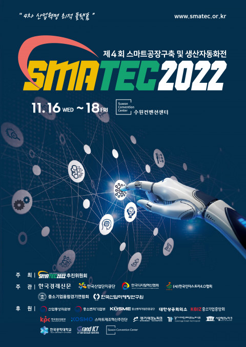 ▲ SMATEC 2022, 수원컨벤션센터에서 11월 16일 개막한국경제신문, 한국산업단지공단, 한국디지털혁신협회, 한국인더스트리4.0협회, 중소기업융합경기연합회, 한국산업마케팅연구원 주관으로 진행되는 ‘제4회 스마트공장구축 및 생산자동화전(Smart Factory & Automation Technology Fair 2022, 이하 SMATEC 2022)’이 11월 16일부터 18일까지 3일간 수원컨벤션센터에서 개최된다. ‘첨단 제조 기술 미래의 힘’을 주제로 개최되는 이번 전시회에는 제조업의 스마트화와 혁신을 가속할 120업체가 300부스 규모로 참가한다.