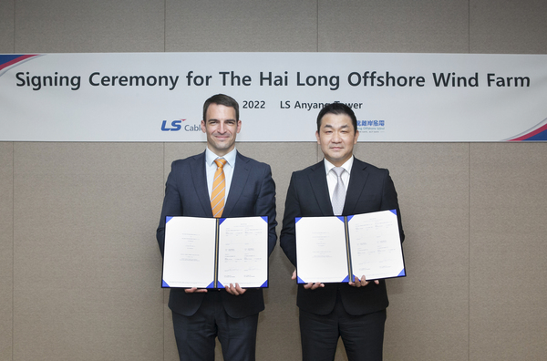 ▲ (왼쪽부터) 하이롱 해상풍력개발 펠리페 몬테로 사업총괄이사와 LS전선 고의곤 해저글로벌사업부문장(상무)LS전선은 대만 하이롱 해상풍력단지에 1억 5,000만 유로(약 2,092억 원) 규모의 해저케이블 공급 계약을 체결했다고 9일 밝혔다. 이번 계약은 2021년 10월 체결한 우선협상대상자 계약의 본계약이다.