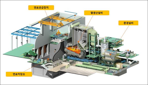 열 생산설비의 공정은 ▶연소로(수냉식, 자동 제어식) ▶보일러(1-Drum) ▶비촉매식 질소산화물 제거설비(SNCR) ▶반건식 반응탑(SDR) ▶건식 반응탑(DR) ▶여과집진기(Bag Filter) ▶스팀 가스가열기(SGH) ▶촉매식 질소산화물 제거설비(SCR) ▶열교환기(2nd 절탄기) ▶유인송풍기(ID Fan) ▶습식세정탑(Wet Scrubber) ▶백연방지 설비 ▶굴뚝(Stack)으로 구성돼 있다.