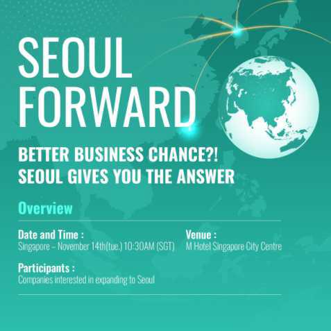 서울시는 싱가포르 소재 글로벌 및 현지 기업 중 서울 진출을 희망하는 기업 유치 로드쇼 서울 포워드를 11월 14일(화), 싱가포르 M Hotel에서 개최한다고 밝혔다.