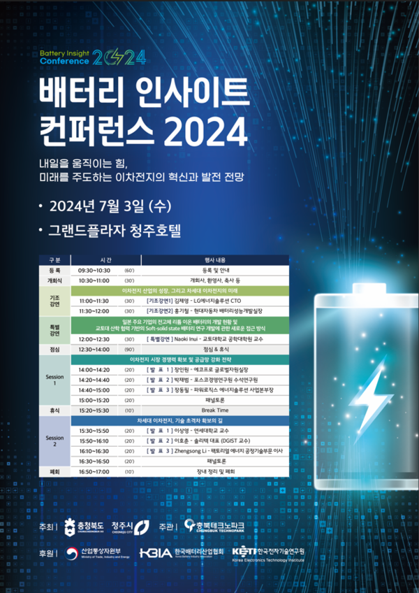 이번 행사는 2021년 이차전지 ‘소재부품장비 특화단지’ 지정에 이어 지난해 ‘국가첨단전략산업 특화단지’로 지정된 이후 충정북도에서 열리는 배터리 관련 첫 행사다. 충청북도와 청주시가 주최하고, 충북테크노파크가 주관하고, 산업통상자원부와 한국배터리산업협회·한국전자기술연구원이 후원하며, 국내외 이차전지 산업 관련 전문가 및 관계자 200여 명이 참석할 예정이다.