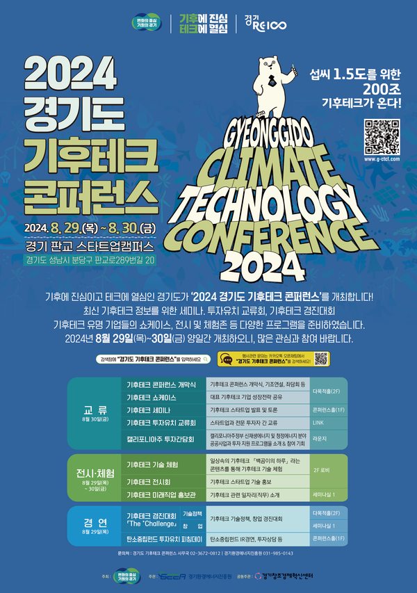 ▲ 경기환경에너지진흥원·경기창조경제혁신센터, 2024 경기도 기후테크 콘퍼런스 개최경기환경에너지진흥원은 8월 29일(목)~30일(금) 경기 스타트업캠퍼스(판교)에서 ‘2024 경기도 기후테크 콘퍼런스’를 개최한다.
