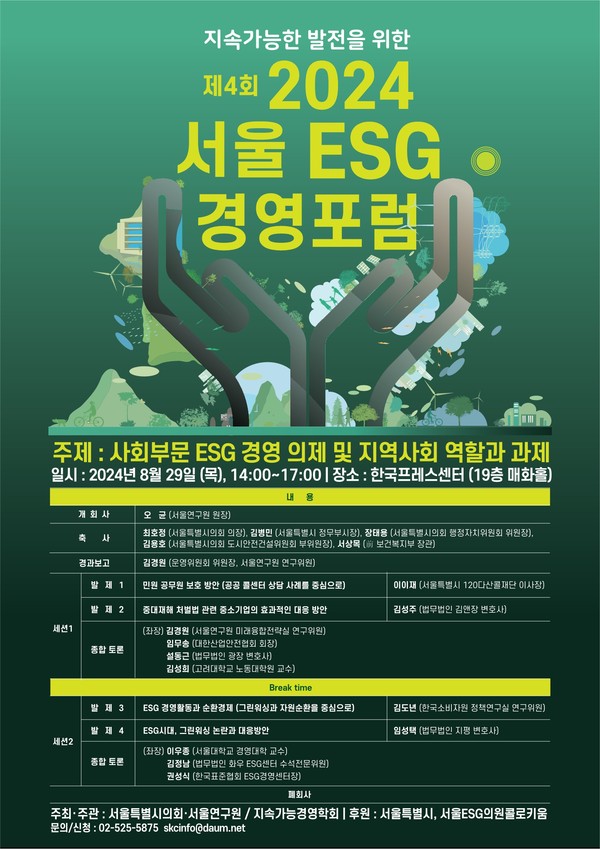 ▲ 서울연구원, ESG 경영 이슈 논의로 진정성 있는 지속 가능 경영 선도서울연구원은 오는 8월 29일 오후 2시부터 한국프레스센터 19층 매화홀에서 서울특별시의회가 주최하고 지속가능경영학회와 공동주관하는 제4회 ‘서울 ESG 경영포럼’을 개최한다.