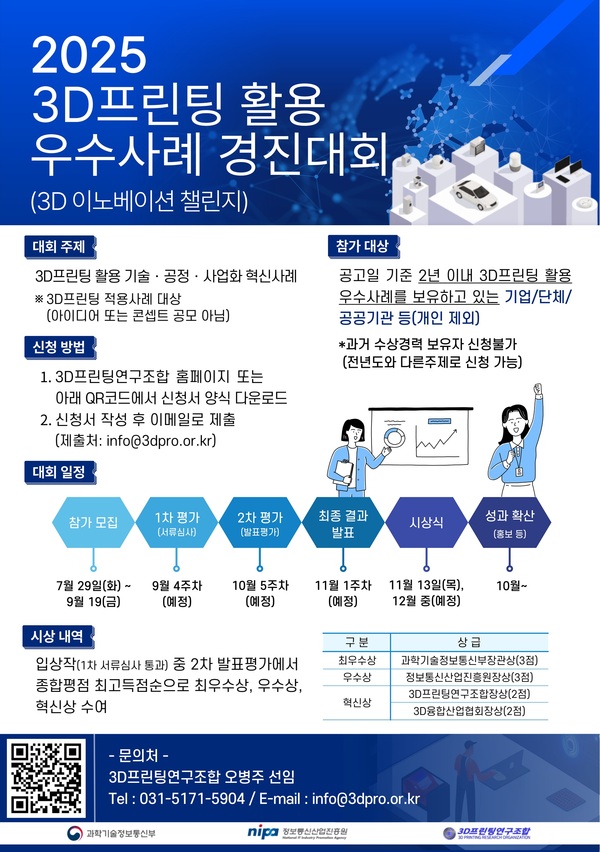 과학기술정보통신부가 주최하고 정보통신산업진흥원과 3D프린팅연구조합이 공동 주관하는 이번 대회는 3D프린팅 기술을 활용한 창의적이고 실용적인 혁신 사례를 발굴하고, 이를 산업 전반으로 확산하기 위한 목적으로 마련됐다.