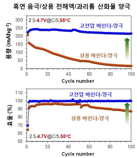▲ 고전압 바인더 적용 양극을 탑재한 리튬이차전지 충방전 성능의 획기적 향상