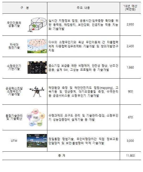 과학기술정보통신부는 ‘무인이동체 미래선도 핵심기술개발사업’ 추진위원회를 개최하여 2018년 총 119억원 규모의 사업 시행계획을 확정하고, 사업을 본격 추진한다고 밝혔다.