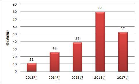 ▲ 안내로봇 분야 연도별 출원동향(’13~’17)특허청은 AI에 기반한 안내로봇 분야 특허출원이 2013년부터 본격적으로 시작되어, 2015년 이후 급증하고 있다고 밝혔다.