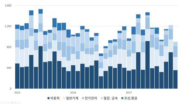 산업부문별로 보면 공작기계는 2014년부터 2016년까지 해마다 감소하던 수주액이 2017년 큰 폭으로 증가했다. 특히 전기전자 분야는 2월부터 9월까지 모두 전년 동기 대비 40% 이상 증가하는 두드러진 성장으로 공작기계 분야 성장세를 이끌었다.