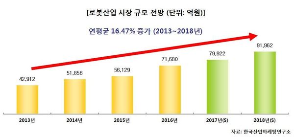한국산업마케팅연구소가 발간한 보고서에 따르면 향후 한국 로봇산업은 2018년 9조1962억원을 기록하며 2016년 대비 28.30% 확대될 전망이다. 특히 2016년 대비 로봇시스템이 1조2753억원 증가하여 가장 크게 확대될 것으로 전망되며 로봇서비스(1조707억원 증가), 제조업용 로봇(9483억원 증가), 전문서비스용 로봇(7037억원 증가), 로봇부품 및 부분품(5397억원 증가), 로봇임베디드(3405억원 증가), 개인서비스용 로봇(268억원 증가) 순으로 확대가 예상된다.