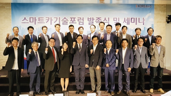 ▲ 스마트카기술포럼 발족식 및 기념 세미나 운영위원단한국정보산업연합회는 과학기술정보통신부, 한국정보통신기술협회와 공동으로 스마트카 관련 산학연이 협력하여 신부가가치 산업이자 미래혁신성장동력 분야인 스마트카 산업의 활성화를 위한 ‘스마트카기술포럼’을 발족했다.