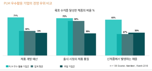 이번 조사에 따르면 통합형 PLM 시스템을 사용하는 기업에서는 ▶업계 평균 대비 연간 엔지니어링 생산성 향상률 2.4배 향상 ▶목표 날짜에 맞춰 제품 생산하는 비율 58% 증가 ▶제품 개발 예산을 충족하는 비율 22% 증가 ▶출시 시점에 품질 목표를 달성하는 비율 21% 증가와 같은 경쟁 우위를 경험한 것으로 분석됐다.