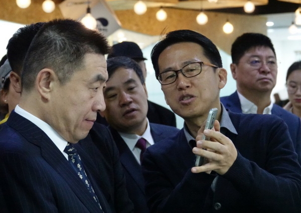 ▲ 석윤찬 비주얼캠프 대표(사진 중앙 오른쪽)가 가군 치타이허시 시장에게 시선추적기술에 대해 시연하고 있다.