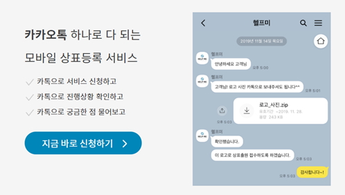 이용방법은 간단하다. 카톡을 열어 서비스를 신청하면 카톡에서 견적서를 받는다. 하나의 카톡창에서 진행상황 알림을 받고, 궁금한 것을 물어보면 된다. 버튼을 선택하고, 간단한 정보를 입력하면 상표등록 절차가 금방 끝난다.