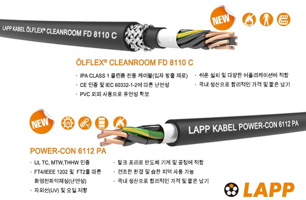 ▲ 랍코리아는 반도체·디스플레이 공정 및 무빙용 케이블 클린룸 8110 및 8110 C와 트레이 및 기기선 케이블 파워콘 6111와 6112 제품 등 총 7종을 출시했다. 독일 산업용 케이블 전문 생산 공급업체 랍그룹(LAPP GROUP)의 한국지사인 랍코리아가 반도체·디스플레이 산업에 특화된 신제품을 선보인다.