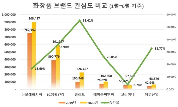 조사 대상은 아모레퍼시픽, LG생활건강, 클리오, 에이블씨엔씨, 코리아나, 애경산업이다. 조사 기간은 2019년 1월 1일~2019년 6월 30일과 2020년 1월 1일~6월 30일로 두 기간의 정보량을 비교했다. 참고로 각 기업별 스킨케어 대표 브랜드명도 함께 검색했다.