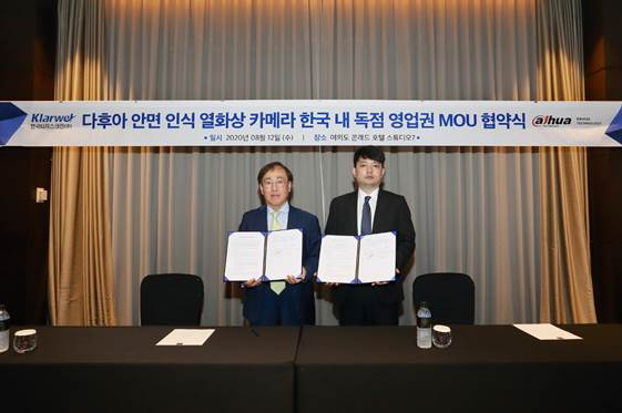 ▲ 한국터치스크린㈜이 지난 12일(수) 다후아테크놀로지와 ‘클라웰 안면 인식 열화상 카메라’ 국내 독점 영업을 위한 양해각서(MOU)를 체결했다. (왼쪽부터) 한국터치스크린 차배언 대표이사, 다후아테크놀로지 제이슨 류 한국지사장전자부품 생산·물류 전문 기업 한국터치스크린㈜이 지난 12일(수) 다후아테크놀로지(Dahua Technology)와 ‘클라웰 안면 인식 열화상 카메라’ 국내 독점 영업을 위한 양해각서(MOU)를 체결했다.